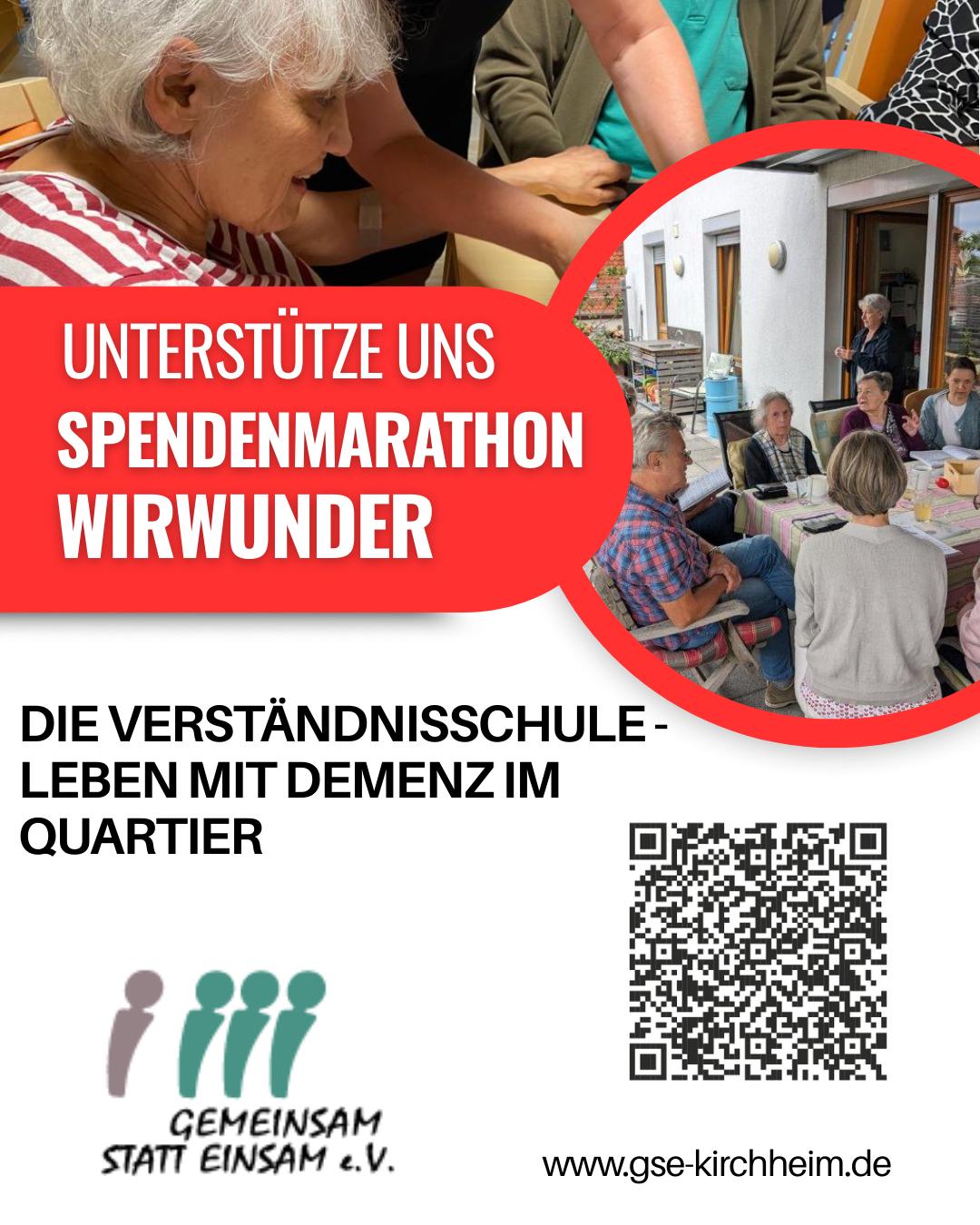 Für unser Herzensprojekt „Verständnisschule – mit Demenz leben im Quartier“ haben wir die Zusage der deutschen Fernsehlotterie bekommen. Das freut uns alle mächtig. Nun können wir endlich loslegen und das Thema Demenz in unserer Stadt sichtbarer machen. Allerdings heißt das auch, richtig kräftig die Werbetrommel zu rühren. Wir müssen ja schließlich den Eigenanteil an Spenden beisteuern. Daher kommt der Spendenmarathon der Kreissparkasse genau zum richtigen Zeitpunkt. Also egal ob groß oder klein, wir freuen uns über jede Spende.